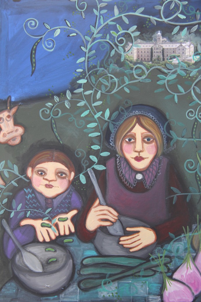 Informant’s notes: This is a painting of Jack and the Beanstalk and was part of a series of paintings for a North Sydney combined exhibition in October (2014) called Palate to palette. My themes are fairy stories and their food. Paintings include Jack, Sing a song of sixpence (not a fairy story), Goldilocks, L Red Riding Hood, and Hansel and Gretel.